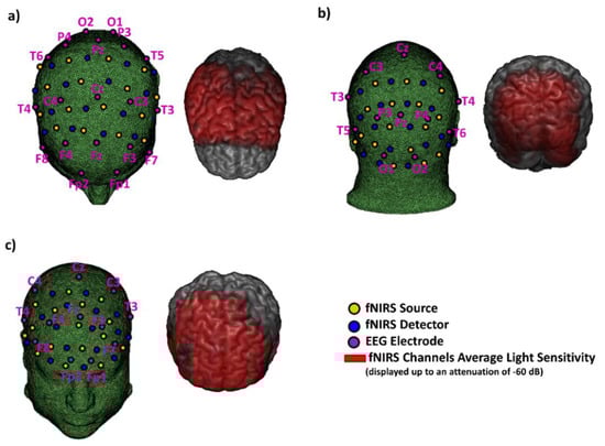 fNIRS optodes and EEG electrodes configurations employed during the administration of the different tasks. fNIRS channels layout varied according to the task investigating the motor (a), visual (b), and prefrontal cortices (c). The electrodes were located according to the 10/20 system. All three recordings were performed employing 16 bicolor LEDs, 16 SiPMs and 19 electrodes. Light sensitivity was computed with the Finite Element Method (FEM) [46] using a template head and brain.