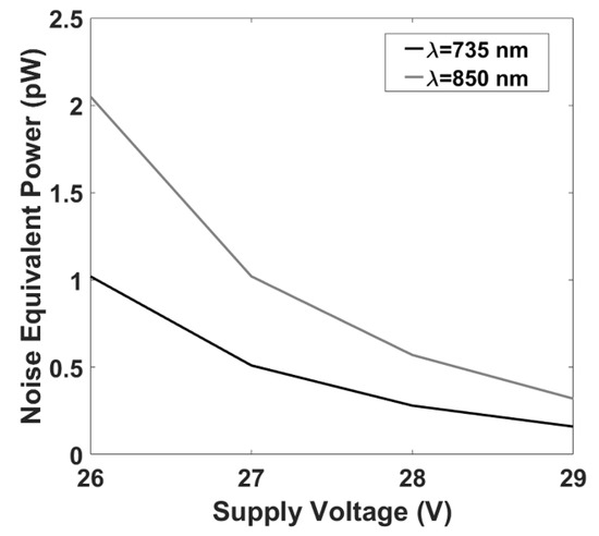 Figure 5 reports the end-to-end NEP at different SIPM supply voltages at the two wavelengths employed. Supply voltage was evaluated from 26 V, which is below its breakdown voltage, up to 29 V, which is beyond the breakdown voltage. The NEPs were evaluated at a sampling frequency of 781.2 Hz. Although SiPMs usually feature higher responsivities for overvoltages exceeding 29 V, they generally lose response linearity, which is essential for fNIRS. For this reason, these voltages were not characterized.
