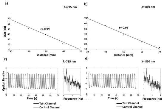 Figure 6c,d shows examples of temporal oscillations in ODs and associated spectra obtained from the measurements assessing channels’ crosstalk. The modulation in the signal acquired in the test channel (where the interoptode distance was periodically varied) was clearly absent in the control channel (where the interoptode distance was kept constant). The same results were obtained for both wavelengths (Figure 6c,d) and for all the channels tested.