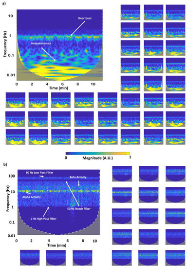 (a) Example of continuous wavelet decompositions of fNIRS ODs performed during the motor task in one subject. The recordings are reported for signals in multiple channels for the 850 nm wavelength. In the time-frequency decomposition, hemodynamic (below 0.1 Hz) and heartbeat components (at around 1 Hz) are visible in all the channels displayed. The presence of a heartbeat signal is considered indicative of a high SNR of continuous wave (CW)-fNIRS recordings; (b) example of continuous wavelet decompositions of EEG recordings performed during the motor task in one subject. A clear alpha band component (at around 10 Hz) is present in all the displayed channels, depicting the quality of the EEG recordings.