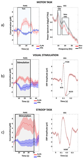Figure 8 reports examples of single subject, single channel, average hemodynamic responses as measured by fNIRS together with average electrical responses as measured by EEG for the three tasks performed. Typical hemodynamic activity is visible in the fNIRS signal, i.e., increase in O2Hb associated with a smaller decrease in HHb of few µM (Figure 8a–c). For the EEG, ERD (reduction in power) is visible in the alpha and in the beta bands during the motor task (Figure 8a) with respect to rest and typical VEPs (Figure 8b) and ERPs (Figure 8c) are present in response to the visual and Stroop tasks.