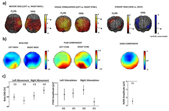 Figure 9a reports fNIRS t-score maps obtained employing a first level GLM analysis and second group level t-test analysis. Stronger activations (i.e., increase in O2Hb and decrease in HHb) in the contralateral motor and visual cortices were found when evaluating the Left vs. Right contrast. For the Stroop task, brain activity (i.e., increase in O2Hb and decrease in HHb during the task) was identified in frontal regions which are compatible with those found in previous work (lateral prefrontal cortices [59]). Two-tailed, uncorrected 5% null hypothesis thresholds (p = 0.05) are reported on the color bars. Figure 9b reports EEG group level average topographies of visual P100 component (mean latency: 106 ± 9 ms) and beta ERD; P100 and beta ERD showed maximum signal in the controlateral visual (O1 for right visual stimulation, O2 for left stimulation) and motor areas (C3 for right movement and C4 for left movement). Figure 9b also reports EEG group level average topography of the N200 ERP for the Stroop task. A clear negative component in the frontal regions was found in accord with the literature [60]. Figure 9c reports group level average ERD in C3 and C4 electrodes for the left and right finger tapping task, group-level average P100 component in O1 and O2 electrodes for the left and right visual stimulation and group level average N200 in Fz for the Stroop task, further corroborating the found activation patterns that met the expectations.
