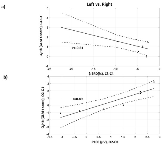 Figure 10 reports the evaluation of the link between EEG electrical and fNIRS hemodynamic brain activity. The regression lines together with their confidence intervals are shown [61]. The controlaterality of brain activity (Left vs. Right contrast) was evaluated in motor (Figure 10a) and visual (Figure 10b) cortices (C4-C3 and O2-O1, 10/20 locations) for both EEG and fNIRS. A significant correlation in EEG and fNIRS controlaterality extent was obtained for both motor (r = −0.81, df = 5, p = 0.02) and visual tasks (r = 0.89, df = 5, p = 6 × 10−3) depicting a neurovascular coupling effect. Importantly, as expected, for the motor task the correlation was negative (increased O2Hb GLM t-score coupled with stronger EEG desynchronization in the beta band) whereas for the visual stimulation the correlation was positive (increased O2Hb GLM t-score coupled with higher P100 amplitude). Notably, whereas the correlation of the visual stimulation is highly robust, the correlation obtained for the motor task, although significantly different from 0, might be driven by a single outlier.