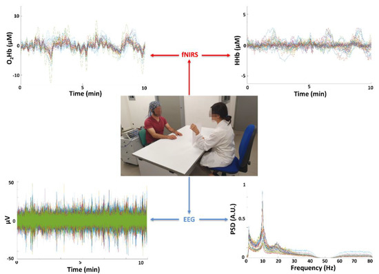 - Chiarelli, A.M.; Zappasodi, F.; Pompeo, F.D.; Merla, A. Simultaneous functional near-infrared spectroscopy and electroencephalography for monitoring of human brain activity and oxygenation: A review. Neurophotonics 2017, 4, 041411. [Google Scholar] [CrossRef]