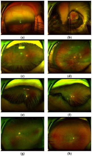 Figure 1 shows several low-quality images taken by this SLO, as well as some high-quality images that are able to use for reliable diagnostics. Figure 1a,b shows outlier images caused by an inadequate distance between ophthalmoscope and patient’s eye or an inadequate movement of the patient at the moment of the image capture. Figure 1c,d show the blurred images caused by a probable movement of the eye or a maladjustment of the equipment. Figure 1e,f show images with obstruction by eyelashes and eyelid. Finally Figure 1g,h shows good-quality images which can be used for reliable diagnostics.