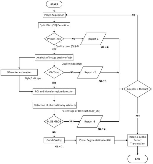 Taking into account the above-mentioned analysis about the retinal image quality, we propose a teleophthalmology support system, which is composed of mainly four steps: OD region segmentation, blurriness analysis of the OD region, ROI segmentation and computation of the grade of obstruction by the artefacts, as well as vessels segmentation in the ROI. The last process is performed only when the input image passed the earlier three steps and is considered as a good-quality image. The block diagram of the proposed system is shown in Figure 2.
