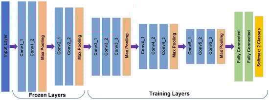 The Vgg16 CNN architecture [23] with different final layer to classify two categories showing the frozen and training layers.