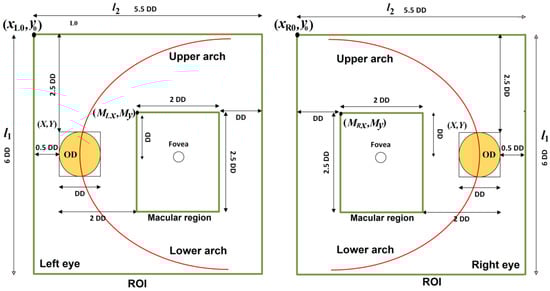 Based on the UK National Screening Committee Guideline [24], we define the region composed by the OD, macular region, upper and lower arches of the principal vessels as the region of interest (ROI) as shown in Figure 7. Once we have obtained the bounding-box of the OD, which is represented as coordinate (X, Y) of its upper-left point and its side length, it is easy to estimate the ROI in the input retinal image. The diameter of the OD, denoted as DD, is approximated as the side length of the bounding-box, and considering the eye (left or right), the location of the ROI is estimated as follows. The upper-left point of the ROI for the left eye and for the right eye , height () and width () of the ROI are calculated by
