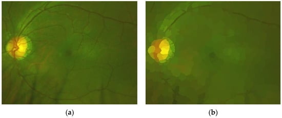 (a) Original ROI and (b) ROI represented by super-pixels.