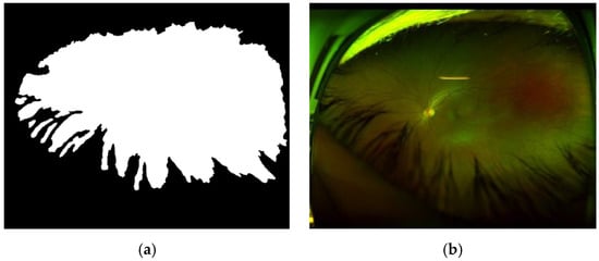 Using images represented by super-pixels, we can generate GT (Ground Truth) effectively to train the SegNet CNN [26] to segment real retinal area from artefacts. Figure 9 shows an example of the generated GT, in which the real retinal area is indicated by a white color (a), and the original image (b) is also shown.