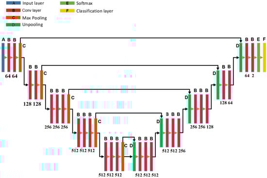 The SegNet [26] has a similar architecture to the U-Net [27], however the up-sampling process of the SegNet employs a technique called unpooling, which saves the locations of a maximum element when the max-pooling operations are performed in the encoder process. In this manner, the SegNet can perform the decoding process more efficiently than the U-Net. Figure 10 shows the SegNet architecture used for this task.
