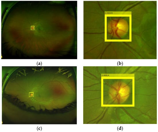 Examples of OD detections. (a,b) OD detection in the input image, (b,d) are amplified version of (a,c), respectively.