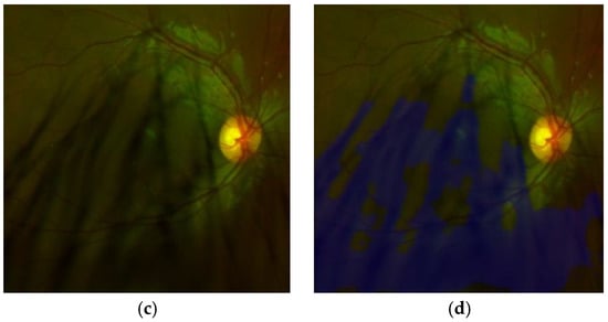 To determine if the obstruction by artefacts in the ROI impedes a reliable diagnostic or not, we set the threshold value ThOB equal to 0.1 (10%), which is the tolerable rate of obstruction in the ROI by artefact. Figure 13 shows some segmented ROI with eyelashes and results of artefact detection, Figure 13a,c are original ROIs and Figure 13b,d shows the results of segmented artefacts, in which Figure 13a,c present, respectively, the artefact rates 3.77% and 41.85%. Then, the ROI shown by Figure 13a is considered as an adequate ROI, while Figure 13c is considered as an obstructed ROI by artefacts due to its obstruction rate becomes larger than the threshold value ThOB (10%). Although there are few images with high obstruction (only 5% of the test set), all of them are detected correctly as obstruction by artefacts, providing an accuracy of 1.0. If the obstruction is detected, the report-3 is provided to the operator.
