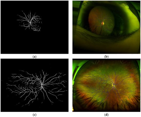 (a,c) results of vessel segmentation. (b,d) the segmented vessel superimposed on the original images.