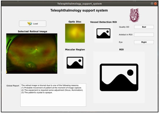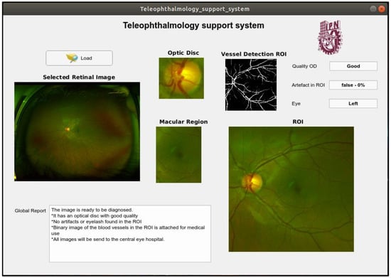 The proposed support system provides a best-quality image among all acquired images (maximum five times in worst case). If the input image is considered good-quality by the system, then its OD image, ROI image, including macular image, and the segmented binary vessel image are provided and transmitted to the central eye hospital together with the input image. If the input image cannot pass the three quality evaluations after the maximum number of repetitions, then the proposed system provides only the better-quality image together with a report generated by the system, which are also transmitted to the central eye hospital for further analysis. In this manner, the proposed system not only provides a useful information to the operator of ophthalmoscope and the patient, but also to the ophthalmologist in the central hospital. Using all information about the retinal image, an ophthalmologist can provide a reliable diagnosis in the absence of the patient. Some captured screens of the proposed systems show its functionality.