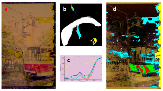 To optimize the spectroscopic study of these frames, automated classification methods were used on these image-data in order to obtain a separation in homogeneous areas, or rather, to group pixels in classes that shared similar spectral trends. This phase of the research focused on testing a series of algorithms and procedures to define these areas. Among the various algorithms tested, a new statistical approach was proposed based on a mathematical model called “UMAP” (Uniform Manifold Approximation and Projection for Dimension Reduction) [25]. UMAP is a scalable algorithm for data dimension reduction that favors the preservation of local distances over global distance. It is built upon mathematical foundations related to the work of Belkin and Niyogi on Laplacian eigenmaps [53,54]. In the UMAP procedure, the elements (pixels) that make up the region of interest (ROI) are grouped based on the similarity of their spectral trend (Figure 1b). In this map, lightest areas correspond to the most represented areas. In the distribution map there is a rather compact central body (reported in white), while a peninsula and two detached areas are distinguishable in its periphery. To recognize the pixels on the sRGB image grouped by spectral similarity in these areas, an arbitrary color has been assigned to these zones (or classes). In Figure 1b five classes of pixels are highlighted in red, green, blue, cyan, and yellow. The corresponding average transmittance spectra, representative of these classes, are shown in Figure 1c. It can be observed that the classes represented with red, green, and blue colors have similar spectral trends, which are mainly dominated by spectral features of the magenta color present in part of the tram body (Figure 1d). The spectral differences in these three classes are instead related to the darker tone of the portion of the tram (blue curve), to the areas that are partially overshadowed by the trees (green curve) and to the remaining part under the sunrays (red curve). The red area in Figure 1d could also be related to the portion of the frame that was damaged by water. The other two classes, cyan and yellow, map the distribution in the frame sections that are lightly and severely damaged, respectively. The yellow class, particularly, groups pixels with spectra that show weak spectral features originating from the chromatic emulsions of the film during the harsh washing process during and after the flood.