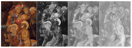 Due to a standardized experimental acquisition protocol, that includes reproducibility of illumination, data-acquisition, repositioning, etc., IFAC-CNR HSI device measurements guarantee comparability between different measurements sessions. In this specific case, it was possible to colorimetrically compare the images collected before and after the restoration procedures on the painting. These data were stored as CIEL*a*b*76 TIF images files; it was possible, therefore, to visualize the three-color parameters (L*, a*, b*) as three separated grey level maps, in which high values for the three parameters corresponded to brighter pixels in the resulting image file. In Figure 2, the reconstruction of a detail of the scene “the Resurrection of Lazarus” is reported. Here, the sRGB image reconstructed from the HSI data at the end of the restoration procedure is reported together with the images of the b* colorimetric values calculated for the CIEL*a*b*1976 color space before and after the restoration, and with their color-difference image. In the analysis of this detail—as the gamut of the colors used by the artist was dramatically reduced after the fire of 1897 and by the previous restoration, it is evident that the color parameters have changed with different extents depending on the areas of the paintings. As an example, three spots were highlighted and their colorimetric values were calculated from the data cube (Table 1). They were chosen in order to show the chromatic effect of the restoration procedure on three colors, which are affected in a different manner by the presence of a yellowish aged varnish. Furthermore, this effect, which can be visually appreciated, has to be documented by using a CIE colorimetric approach. To better visualize the results on the painting after the removal of the aged varnish, CIE b* value can be used; it represents the blue–yellow component, with yellow and blue in the positive and negative directions, respectively. In this case, as expected, the bluish area (point 1) reduced the amount of yellow, while the red and flesh tone areas (points 2 and 3, respectively) increased this value resulting after the restoration more yellow (and red) than before. In addition, a* and L* values increased at different levels once the work was finished.