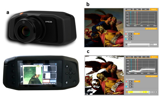 (a) Specim IQ hyper-spectral camera; (b) image displayed in the camera’s screen with the pixel’s reflectance spectrum; (c) cobalt blue distribution map provided by the SAM algorithm in the camera software (in white) on the painting’s surface (figure modified from [60]).