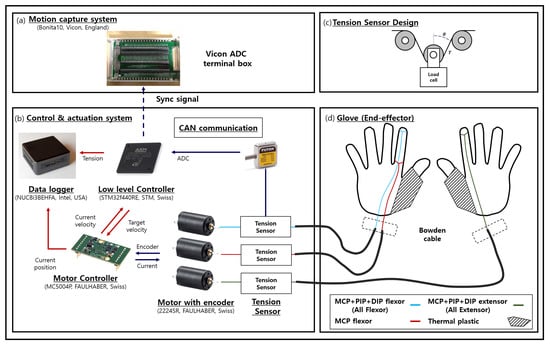 Schematic view of the Exo-Index system; (a) shows an external device for synchronizing load cell data measured in the MCU and posture data measured by the Vicon; (b) shows overall control and actuation system for the robot; (c) shows how the tension sensor is designed using loadcell; (d) provides a brief look at how the three tendons of the actuator are connected to the glove.