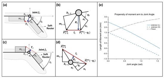 As shown in Figure 2, the path and moment arm of the tendon changes according to the joint angle. This is because routers rotate as the finger moves. The position of the router when the joint angle is is simply derived using the rotation matrix, as shown in Equation (1), by using the initial position of the router shown in Figure 2.