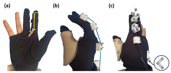 However, the adaptability of a robot generated with a soft structure and tendon transmission could cause difficulties in wearable robot control; this is because these approaches increase the uncertainties, which originate from both elongation of the soft material and from undefined human properties [,]. For example, soft structure elongates when force is applied; this elongation induces difficulty in estimating the acting point and the direction of the force. Also, estimation of the joint angle using actuation information is not easily solved. This is because most tendon-driven hand wearable robots actuate several joints via a smaller number of actuation wires for compactness. In these cases, numerous joints rotate even when only a single wire is pulled; therefore, the joint angle cannot be decided using only the wire stroke. Instead, the position of the joints are decided by joint stiffness, wire moment arm, and wire tension; these are not easy to estimate due to human uncertainties and uncertainties from the elongation of soft materials.