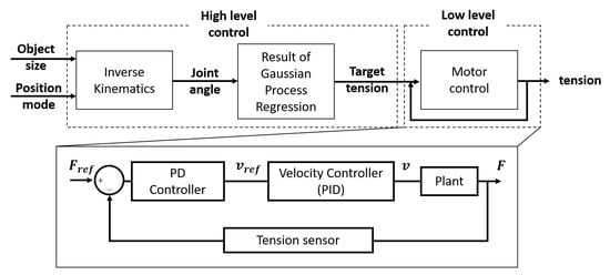 The actuation system consists of three independent tendon driven actuators (FAULHABER, Croglio, Switzerland). These three actuators are controlled by a microcontroller unit (ST Microelectronics, Geneva, Switzerland) and three motor drivers (FAULHABER, Croglio, Switzerland) under CANopen communication. Overall control scheme of the proposed robot can be expressed as Figure 4. The high level control roles to find out the appropriate tension that makes grasp posture with given grasp mode. Since the proposed robot does not contain any additional vision sensor, the size of the object and grasp mode (e.g., narrow pinch, wide pinch, and caging) are decided manually. With given object size and grasp mode, target tension of three different actuators are induced by using the result of inverse kinematics and regression. After that, the tension is controlled by a low level controller using additional tension sensors designed with loadcells (FUTEK, Irvine, California, USA); Detail schematic of tension sensor with loadcell is depicted in Figure 1c [] and in the schematic is 0 (rad) in our case. In this controller, admittance control is used; the tension is controlled by velocity, which is based on a PD controller with motor encoder, as shown in Equation (3) and Figure 4 [].