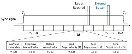 Since the robot system must control three motors while syncing these data with vicon data, time scheduling in the control loop is important. When the system enters into a control state ( in Figure 5), a sync signal is generated from the STM board and is transmitted to the vicon ADC terminal box. Next, the three motors are controlled every 20 ms (). In order to avoid a situation in which the CAN Bus is overloaded, the time-interval () is then divided into 10 sub time-intervals (i.e., the STM chip is controlled at a frequency of 500 Hz.) In every sub time-interval, each task is then scheduled as shown in Figure 5. Since all data is transmitted through a single CAN Bus, it is possible to trust that the synchronization of the data has been done properly. Using the synchronized data, kinematic and stiffness parameter estimation proceeds, as explained in the next section.