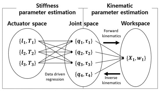 Schematic diagram to show purpose of kinematic identification and stiffness parameters estimation. Stiffness parameter estimation elucidates the relationship between the joint angle and the actuation data. The main purpose of stiffness parameter estimation is to obtain the relationship between the joint and the end-effector; this is highly related to kinematic analysis.