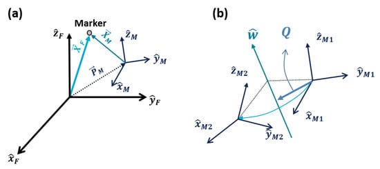 The basic concept of deriving the transformation matrix in Equation (4) is expressing the with respect to the frame {F}, as shown in Equation (6), while , , can be written as Equation (5). From the relationship between the two coordinates shown in Equation (5), the position of the markers in frame {M} can be expressed in a matrix form, as shown in Equation (6). Other details about coordinate transformation can be found in previous works about robotics []. One thing different from traditional robotics is that usually a transformation matrix shows different forms because the matrices are defined to transform a vector from a moving frame to a fixed frame.