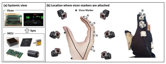 Schematic view of the experimental protocol: (a) shows a systemic view of vicon and the control system. By transmitting a sync signal to the ADC converter of the Vicon system, the loadcell data and encoder data were synchronized with the Vicon data. (b) shows the location where vicon markers are attached. A Total 14 markers are used in this experimental setup; 12 markers are used for the index finger and two markers are attached to the thumb to measure the thumb position.