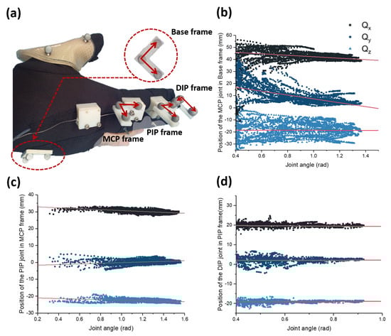 The first result examines kinematic system identification, which is designed to find the joint position. The overall experimental setup is depicted in Figure 9a. Here, three markers are attached to each phalange. In addition, three markers are attached to the back of the hand, resulting in a total of 12 markers attached. Using this experimental setup and a vicon motion capture system, each joint position is obtained as shown in Figure 9b–d. Here, the position of the joints is described in terms of joint angle because human joints move when the joint angle changes. This is because human joints are not pin joints; human joints are usually called rolling contact joints. In these joints, the bone rotates along the surface, while sustaining the contact with other bones. Here, the position of the joint is expressed with respect to the marker frame, which is attached to the bone in the proximal part of the joint. For example, the position of the DIP joint is expressed with respect to the proximal phalanx.