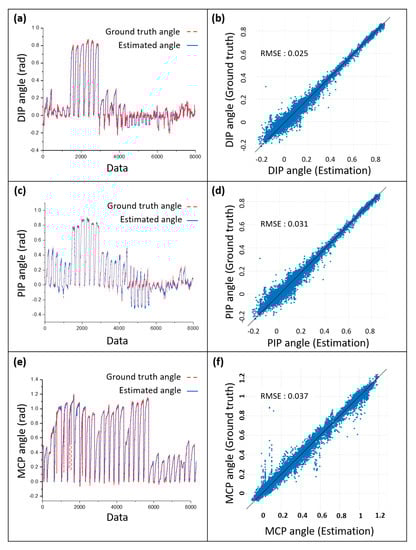 As an alternative to the estimation, the method of using wearable sensors can be considered. One example is attaching strain sensors on the surface of the body. The strain sensor measures the angle of rotation by measuring the change of electric resistance during elongation and compression. Park et al. [] developed a strain sensor with a novel fabrication method known as inkjet-printed SWCNT (Single-walled Carbon Nanotube) film, and this strain sensor can bear the strain up to 80% while others can generally bear up to 5%. This method, however, has a significant weakness under change in humidity. Another wearable sensor which can be used to measuring the rotation angle at the finger joints is IMU sensors [,,]. A typical problem of an IMU sensor is the accumulation of the error in position over time because it integrates the acceleration along the time. Another issue is the discomfort that the wearer feels due to the sensors attached. Moreover, IMU sensors are prone to get affected by external noises and magnetic fields generated by nearby objects. Using RGB-Depth cameras and motion capture systems can also be an alternative method for measuring the joint angles. Zhao et al. [] constructed three-dimensional hand shape using multiple Vicon cameras and a Kinect camera. Some other works dealt with the problem using only a single RGB-D camera and then classified each segment in hand by neural networks [,]. However, methods relying solely on visual data still showed major accuracy problems under occlusions.