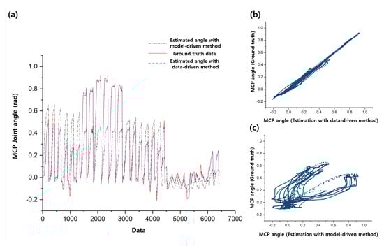 Results of estimation that shows relationship between joint angle and wire tension. (a) shows comparison of the ground truth angle with the estimated angle from data-driven method and the estimated angle from model-driven method; (b) and (c) each show response plot of the data-driven method and model-driven method respectively.