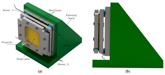 Four piezoelectric force sensors (9011A Kistler) are used to measure the global force induced by the projectile on the target during impact. These sensors are fixed over the plate holder (Figure 3) and allow measuring the dynamic force along the impact velocity direction. The range of the maximum force that the sensors system can measure is 60–80 kN (15 ± 5 kN), and the natural frequency is 65 kHz for each sensor. The four sensors are coupled to an amplificatory device.
