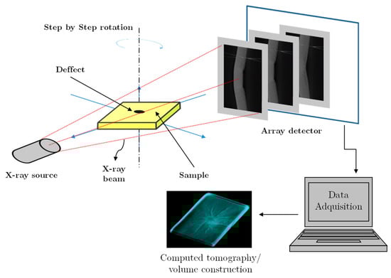 Computerised micro-tomography (CT-scan or CT) is a powerful technique which consists of X-Ray scanning axial images of high quality and precision. An X-ray beam is projected on the sample to be analysed, and part of the radiation that has not been absorbed by the object is collected by detectors like a spectrum. A data acquisition system transforms the data obtained by the sensors into digital images. From this, a grayscale voxel image that depends on the number of electrons that has been absorbed by the object is obtained. Greyscale is limited by white colour, associated with undamaged material, and black colour, due to a change in density because of the presence of air as a result of breaks or defects. A scheme of a CT process is shown in Figure 5.