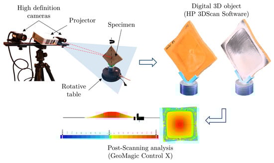 As part of the post-processing of the scan, final shape representation is exported to the GeoMagic Control XTM software that allows the display and quantification of dimensions, superficial defects, wear and tear compared with the no tested specimen, among others. In our case, it allows us to determine the induced deflection in the plate due to the type of projectile and impact velocity. A scheme of the scanning process is represented in Figure 6.