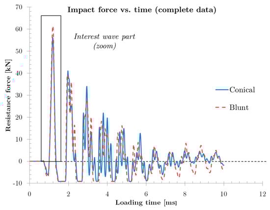 Resistance force history recorded using piezoelectric sensors for blunt and conical projectile (impact velocity v = 174 m/s).