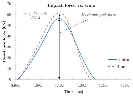 As mentioned, all the projectiles analysed in this work have the same mass, although the nose shape may be different. Curves represented in Figure 8 for projectiles with similar impact energy lead to different maximum impact force peak due to the different shape nose. Blunt projectile presents higher values () than the conical one (). The maximum peak force occurs when projectiles transferred all kinetic energy to the plate. The time amplitude of the force-time curve of the blunt projectile () is smaller than for the conical projectile (), this may indicate lower overall plate deformation as will be shown below.
