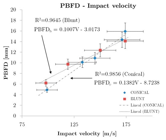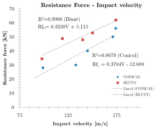 The results for the impact range considered have been adjusted to a linear trend for every nose-shape. The correlation coefficients (R-value) are R2 = 0.9006 and R2 = 0.8679 for the blunt and conical case, respectively, representing a good (and adequate) correlation with experimental values, as can be seen in Figure 9. Although both slopes are quite similar, resistance force for any impact velocity is always lower in the conical case, due to its greater penetration power than the blunt projectile, reducing the stiffness of the plate and producing a lower peak force for the same impact load.