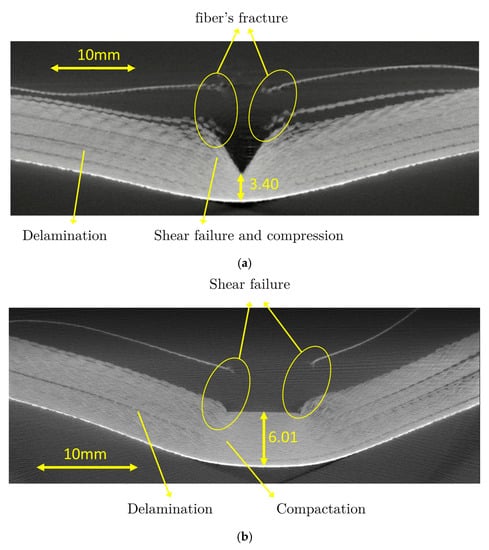 The failure mechanisms and the morphology of the penetration process have been analysed through computed tomography, described in Section 2.3.1. Figure 10 demonstrates the capacity of this technique to report, in a non-destructive mode, the internal damage of the specimen after impact. These images are taken close to the impact zone, where the most significant penetration of the projectiles is observed. The high-resolution images allow distinguishing delamination, ruptures and crushing.