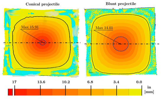 Figure 11 shows the displacement map in the projectile impact direction on plates impacted by a conical and blunt projectile at 174 m/s. In all cases, the maximum displacement is obtained at the impact zone, close to the specimen centre, decreasing to the encastred perimeter. For the velocity presented, these maximum values are 15.91 and 14.01 mm for the conical and blunt projectiles, respectively. Due to the characteristics of the problem, symmetric patterns are displacement is achieved. Contour lines indicate higher displacement gradient for the conical tip-shape. For a particular impact velocity, the larger area of deformation is obtained with the blunt projectile (marked with the continuous black line built thanks to by the GeoMagic Control XTM software), being very close to the encastred boundary.