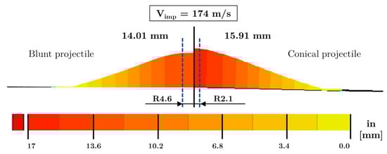 The 3D scanner allows analysing any virtual cut section of the specimen through the thickness. In particular, virtual sections by the dotted line (through thickness plane) sketched in Figure 11 are presented in Figure 12 for a better comparison. It can be observed that the specimen impacted with a blunt projectile has a lower displacement gradient and a more permanent deformation than the conical one, and it is flattened due to the morphology of the projectile, being less pronounced than with the conical projectile. The maximum deflection, reached in the conical case, is obtained strictly at the projectile/plate impact point; meanwhile, the blunt projectile presents an almost constant value close to the impact zone.
