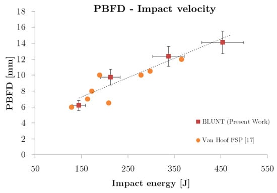 Although there are other works in the literature about ballistic impact testing on aramid composites, there is a wide variety of impact range (mass, velocity tip-shapes), types of aramid and specimen dimensions that complicate comparisons with the present results. However, within the limited literature for the blunt projectile, the results have been compared with the work developed by Van Hoof [17], see Figure 14. In that work, the dimensions of the specimen, number of composite layers, and the boundary conditions are similar, although the projectile used (FSP) has a reasonably similar geometry to the blunt projectile, the size and the aspect ratio is lower, hence the possible differences that can be observed. Both results present similar trends for the back face deformation (PBFD) in the impact energy range studied, where the PBFD increases linearly in all cases with energy, with a similar slope considering a linear regression.