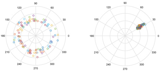 (Left) Complex values, in polar coordinates, corresponding to subcarrier of 100 raw channel state information (CSI) measurements. (Right) The same values after phase calibration.
