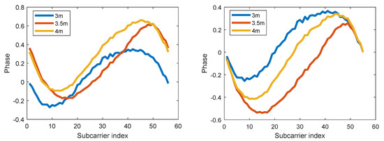 The calibrated phase is stable at a fixed position. However, it changes drastically from one position to another. This occurs because, theoretically, for a subcarrier at 2.4 GHz, the phase goes through an entire cycle in a wavelength distance (about 12.5 cm). This is much shorter than the distance between positions used to build the fingerprint database. To go around this, instead of using the compensated phases , , we use their differences , , with respect to the first component, and unwrap them so as to avoid that jumps , , are bigger than or equal to . This is equivalent to consider that the frequency of the first subcarrier is zero, and the frequencies of each other subcarriers are 312.5 KHz, 625 KHz,..., 20 MHz. Then, the smallest wavelength among these subcarriers becomes . Figure 2, shows how phase differences change more consistently than plain phases in a sequence of three points, arranged in a straight line, 0.5 m away from each other.