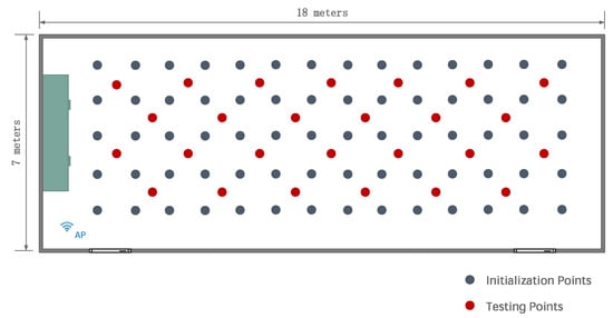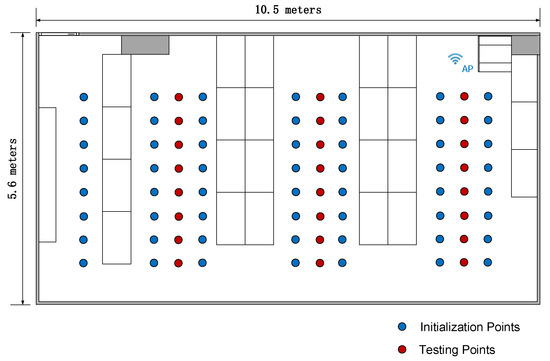 We use two experimental setups. The first one is an empty room. This setup permits evaluating the positioning performance of the different methods in the ideal situation in which fingerprints used for positioning are as similar as possible to those used during the initialization stage. The setup is depicted in Figure 3, showing the wireless access point in a corner. The figure also shows the positions (marked as initialization points) used as ground truth positions for constructing the fingerprint model. In addition, there are 26 points for testing the static and dynamic positioning algorithms. Figure 4 shows the first entry of the averaged fingerprints at each initialization point , , together with the value yield by the estimated model .
