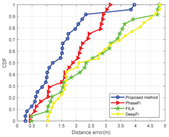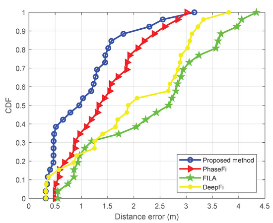Figure 6 and Figure 7 show the cumulative distribution function (CDF) of the positioning error (in meters), (i.e., the relative number of points at which the localization error is smaller than each distance error in the horizontal axis) for the aforementioned four methods and the two setups. Table 1 and Table 2 show the minimum and mean positioning errors also for the four methods and both setups. These results show that our proposed method significantly outperforms the FILA, DeepFi and PhaseFi methods in both scenarios.