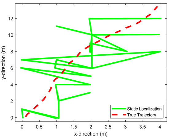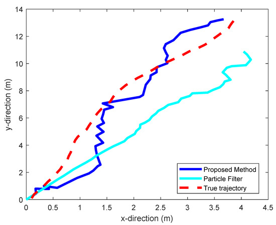 To evaluate this performance, we moved the receiver over a trajectory that is well modeled by this equation. This trajectory is shown in red in Figure 8 and Figure 9. Figure 8 shows the trajectory estimated by our static positioning method. Figure 9 shows the one estimated using a particle filter [41], and the one estimated by our proposed dynamic positioning method based on the maximum likelihood Kalman filter. Table 3 shows the maximum tracking errors, as well as their means, given by the three methods. We see that the proposed dynamic positioning method offers a significant accuracy improvement over its static counterpart, as well as over particle filtering.