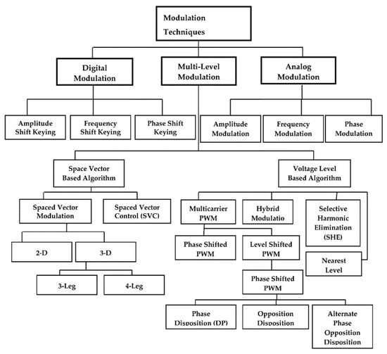 The bipolar method is another coding scheme which is further divided into three main subcategories: Alternate Mark Inversion (AMI), Binary 8 Zero Suppress (B8ZS), and High-Density Bipolar Order 3 (HDB3). Bipolar provides a satisfactory solution to the problems of synchronization, DC, and double bandwidth concerning other digitizing schemes. The AMI technique offers a better solution than all previously discussed digitizing schemes. In a long stream of 1 s, the receiver can quickly determine each bit. It provides a negative to positive jump in the case of 1 s bit signal modulation [19]. There is no DC component issue; no double bandwidth is required to transmit signals. Zero voltages are used to represent bit 0 s. On the other hand, it does not guarantee that the receiver will correctly receive the signal [20]. There are many issues interlinked with digital and analog signal modulation, like bandwidth utilization, the power spectrum, the short and long range of the signal, signal connectivity, etc. Therefore, several modulation techniques have been designed to resolve these issues in the domain of digital modulation, analog modulation, and multi-level modulation for network communication. Table 1 shows the related work summary against the benchmark techniques, whereas, Figure 2 presents the hierarchy of the possible existing modulation techniques for network communication.