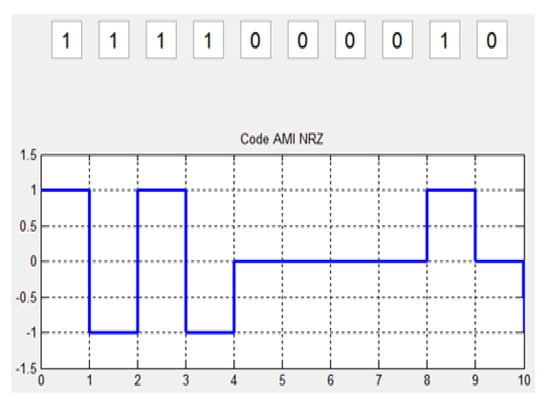 NRZ-L represents a bit with the single waveform in , the plus duration for polar NRZ-L of PSD. Equation (3) shows the PSD of NRZ-L. In Equation (3) “A” represents the 1 bit, which normalizes the unity average of PSD signal. NRZ-L requires a double voltage level for illustration of the 0 s and 1 s in the bitstream [25].